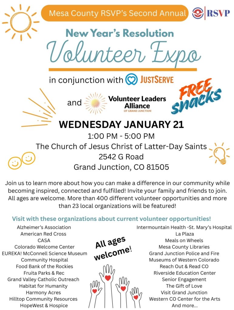 Mesa County RSVP’s Second Annual New Year’s Resolution Volunteer Expo will take place on Wednesday, January 21 from 1:00–5:00 PM at The Church of Jesus Christ of Latter-day Saints, located at 2542 G Road in Grand Junction, CO.
